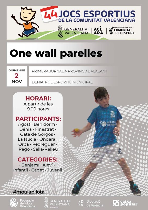 Els Jocs Esportius de one wall parelles, que ja han començat fa alguns dies a la província de Castelló, s’inicien ara també a la província d’Alacant. Concretament al Poliesportiu Municipal de Dénia, que rebrà les partides de la primera jornada de la primera fase dels 44 Jocs Esportius de la Comunitat Valenciana (JECV) en la modalitat de one wall parelles.