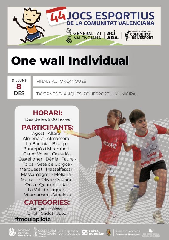 Aquest pont de desembre conclourà la 44 edició dels Jocs Esportius de la Comunitat Valenciana (JECV) en la modalitat de one wall individual i per parelles. La competició per parelles està programada per a dissabte mentre que la individual, serà el dilluns. Ambdós se celebraran al Poliesportiu Municipal de Tavernes Blanques.